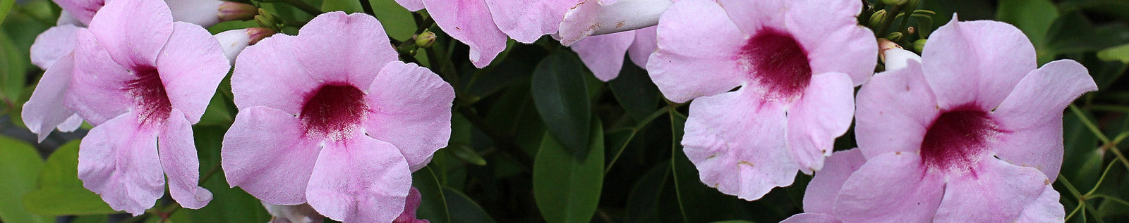 Pandorea, also known as Wonga Wonga Vine or Bower Vine, is a beautiful climbing plant with glossy evergreen foliage and showy, trumpet-shaped flowers in shades of pink, white, or blush—often with a deeper throat. It’s a great choice for covering trellises, fences, and arbors, adding quick vertical color and a lush, tropical feel. Pandorea grows best in sun to part shade with well-drained soil, and once established it can be fairly drought tolerant. Explore our Pandorea selection and let it climb!